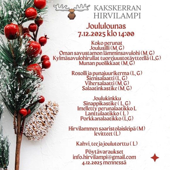 Jouluinen pöytä katettuna Hirvilammella (Vapparintie 692, Kakskerta) sunnuntaina 7.12. klo 14. Pöytävaraukset 4.12.2025 mennessä osoitteeseen info.hirvilampi@gmail.com.