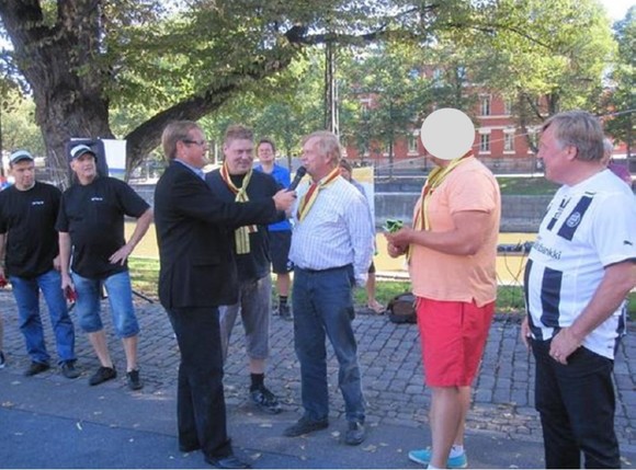 Voittajat JP Jalon haastattelussa. Kisan tuomari Heikki ” Hessu” Suhonen oikealla.