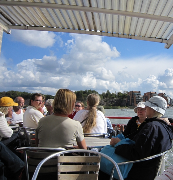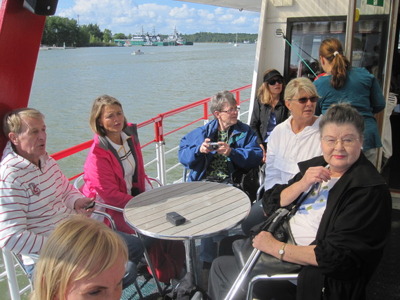 Treffit meinasivat mennä sivu suun – vesibussi odotteli retkeläisiä Aurajoessa, retkeläiset vesibussia Hirvensalossa venehuoltoaseman laiturilla. Kun henkinen ja maallinen yhteys oli saavutettu, päästiin matkaan. Vesibussi oli aikaisemmilta matkoilta tuttu Janina, matkalaisia oli 44, sää aurinkoinen ja lämmin, kevyttä etelätuulta eikä kenenkään mieltä jäänyt painamaan pieni viive lähdössä. Matkalla juotiin kahvit, seurakunnan laituri löytyi omalta paikaltaan ja rantautumisen jälkeen alkoi taivallus metsän läpi kohti riihikirkkoa.