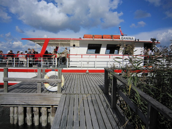 Vesibussi Janina seurakunnan laiturissa Järvistensaaren rannassa, lähdössä kotimatkalle