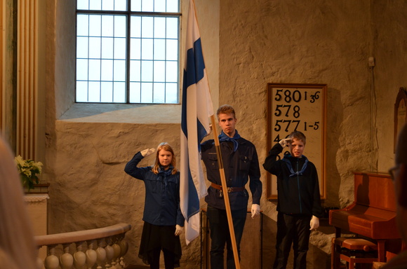 Juhlallisuudet alkoivat kuitenkin jo Kakskerran kirkolla. Itsenäisyyspäivän jumalanpalvelukseen osallistui n. 60 henkilöä. Partiolaisilla oli perinteinen juhlava osuus seremoniassa. Aluksi he toivat alttarille Suomen lipun.