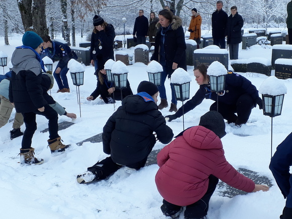 Näiden juhlallisuuksien jälkeen siirryttiin sankarihaudoille ja -muistomerkille. Partiolaiset toivat kynttilät jokaiselle 17 hautakummulle, minkä jälkeen seurakunta ja Kakskertaseura laskivat kukkavihkonsa muistomerkille.