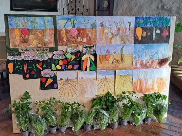 Esillä oli myös Haarlan koulun oppilaiden satoon liittyviä piirroksia.