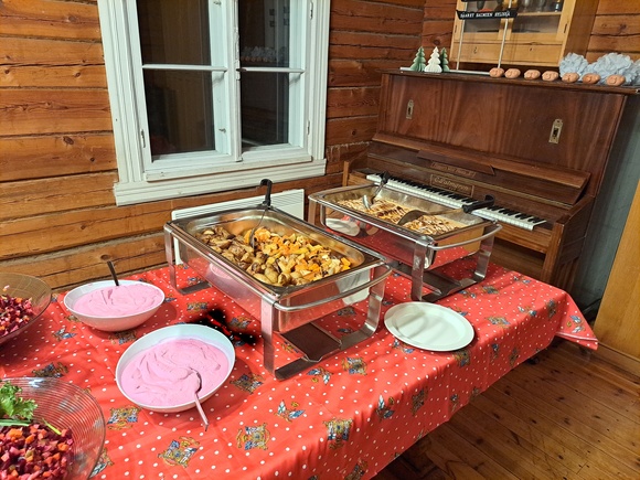 Orkesterin valmistautuessa pantiin ruokapöytä koreaksi, tuotiin pääruoka - porsaan sisäfilettä ja kermainen pippurikastike, paahdetut perunat ja juurekset sekä salaatit - pöytään.