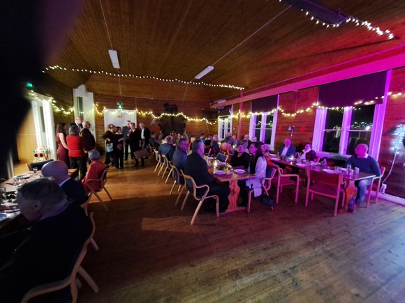 Ja sitten alkoi vieraiden odotus. Jokainen tulija sai mukaansa kuohujuomalasin ja hakeutui itselle mieluisaan pöytään. Vähitellen kaikki 46 olivat paikoillaan ja puheenjohtaja Raimo Västinsalo kertoi Kakskertaseuran terveiset, antoi muutamia käytännön ohjeita ja kohotti maljan illan vietolle.