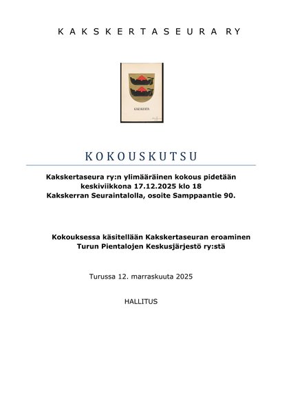 Kakskertaseuran ylimääräinen kokous pidetään Seuraintalolla 17.12. klo 18. Ainoana asiana on seuran eroaminen Turun Pientalojen Keskusjärjestön jäsenyydestä. Kutsu on liitteenä.